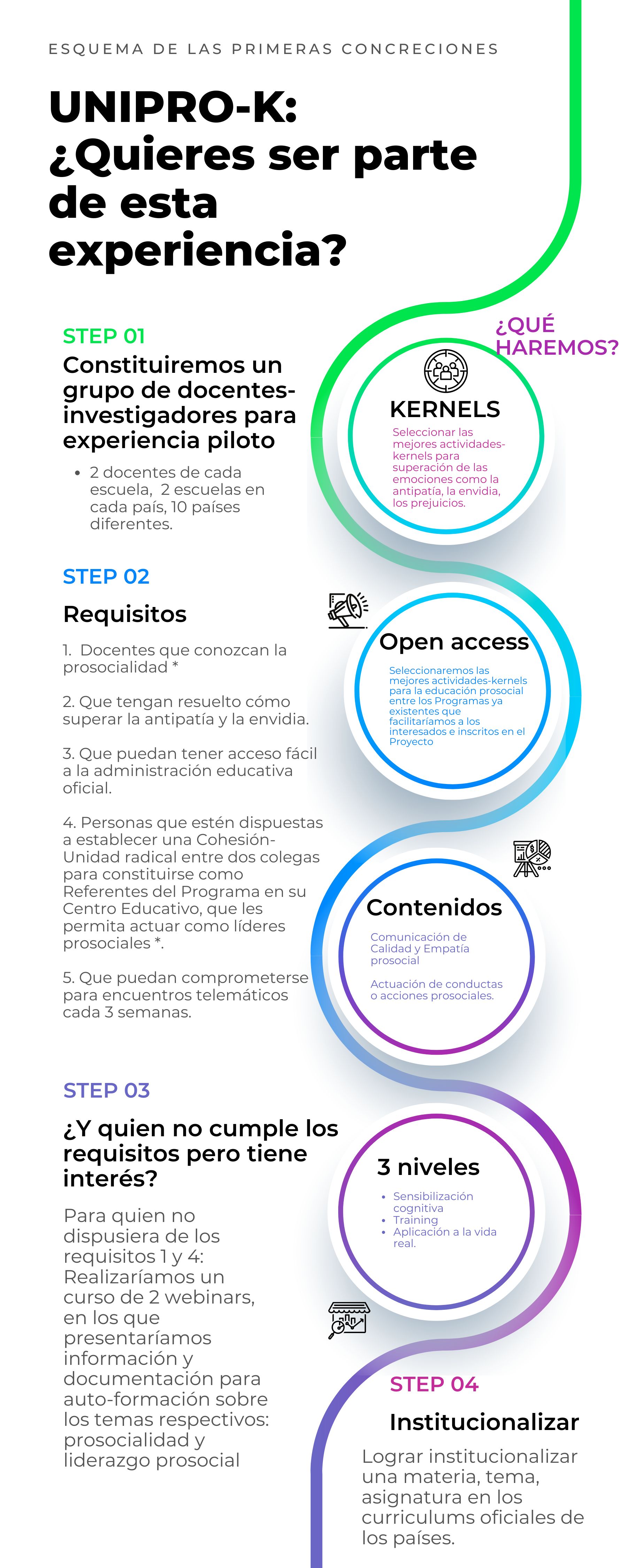 UNIPRO-K es un proyecto de investigación acción participativa que: de manera única, ambiciosa, global intentará identificar, en colaboración con profesionales de diferentes países, cuáles son las claves de intervención segura que garanticen de manera eficiente resultados para aumentar la prosocialidad en edades adolescentes antes de terminar la formación obligatoria.